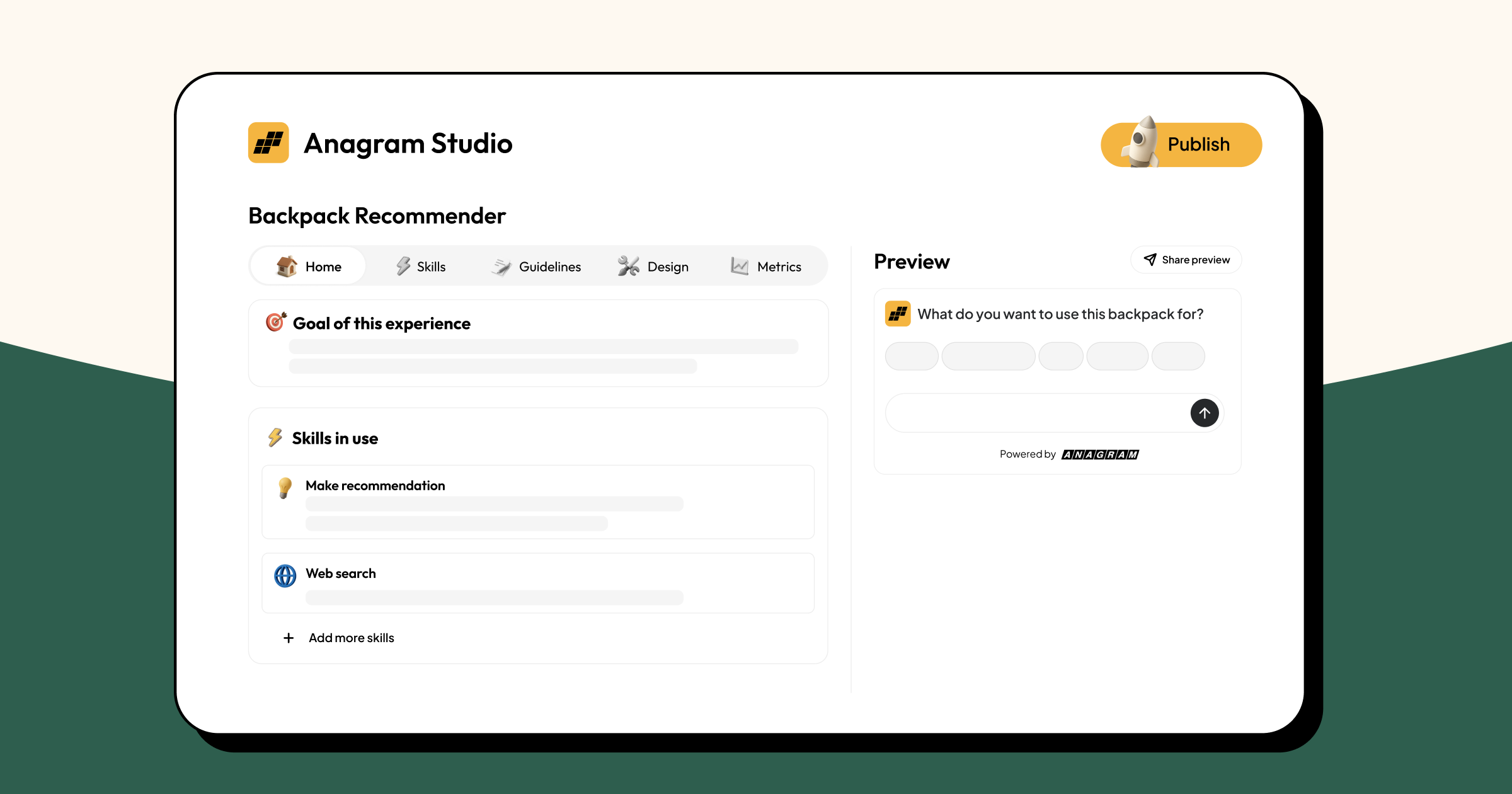 That's Anagram Studio: composable Skills that snap together. The landscaping company's lighting visualizer? That's Generate Image + Qualify Lead + Send to Google Sheet. The backpack recommender? That’s Search Catalog + Recommend Products.